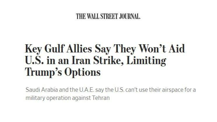 به گزارش تابناک، روزنامه آمریکایی وال استریت ژورنال اعلام کرد: بعد از مخالفت کشورهای حاشیه خلیج فارس با استفاده آمریکا از خاک و آسمان آنها برای حمله به ایران، گزینه های ترامپ برای اقدام نظامی علیه ایران محدود شده است.