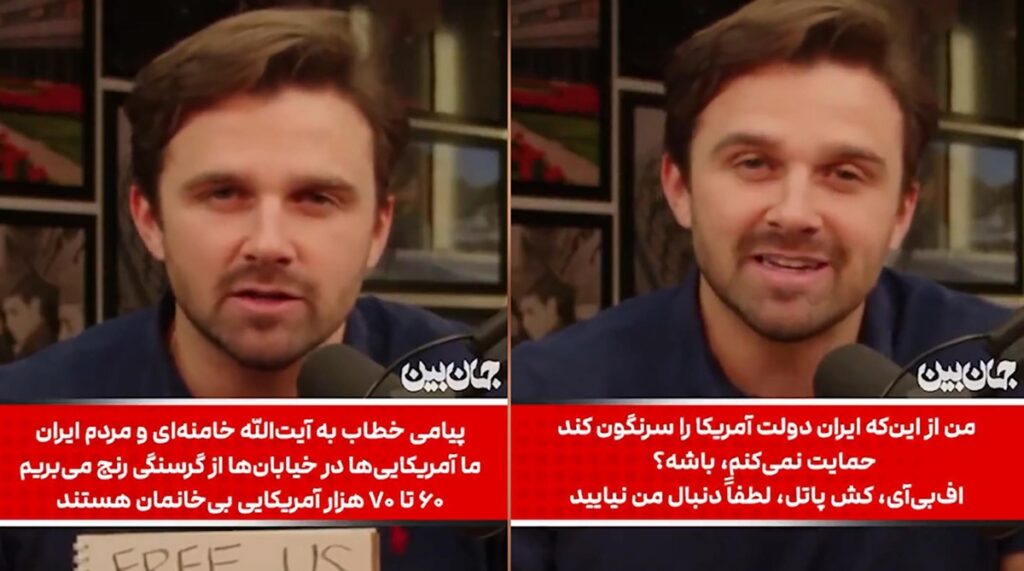 مفسر سیاسی در حالی که روی کاغذی به انگلیسی نوشته بود: «خامنه‌ای ما را آزاد کن!» به سیاستمداران آمریکایی بخاطر دخالت در امور ایران طعنه زد. او گفت: «پیامی خطاب به آیت الله خامنه ای و مردم ایران. ما آمریکایی ها در خیابان ها از گرسنگی رنج می بریم. 60 تا 70 هزار آمریکایی بی خانمان هستند. ما به کمک شما نیاز داریم. ما آمریکایی ها از شما می‌خواهیم مردم آمریکا را از این رژیم فاسد آزاد کنید» با زیرنویس فارسی می‌بینید و می‌شنوید.
