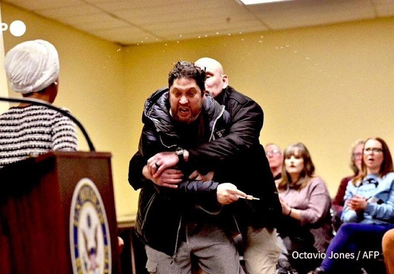 یک شخص هنگام سخنرانی ایلهان عمر، نماینده دموکرات کنگره آمریکا که مورد انتقاد دونالد ترامپ نیز است، حمله کرد.