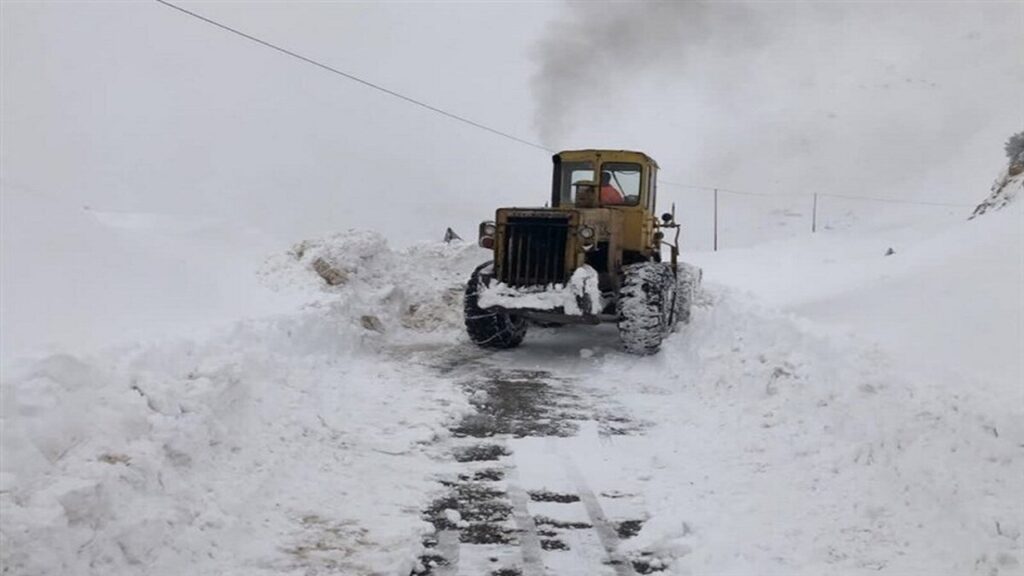 لحظاتی از مانور ماشین برفخوار در عملیات برفروبی جادهای در چهارمحال و بختیاری را مشاهده میکنید.