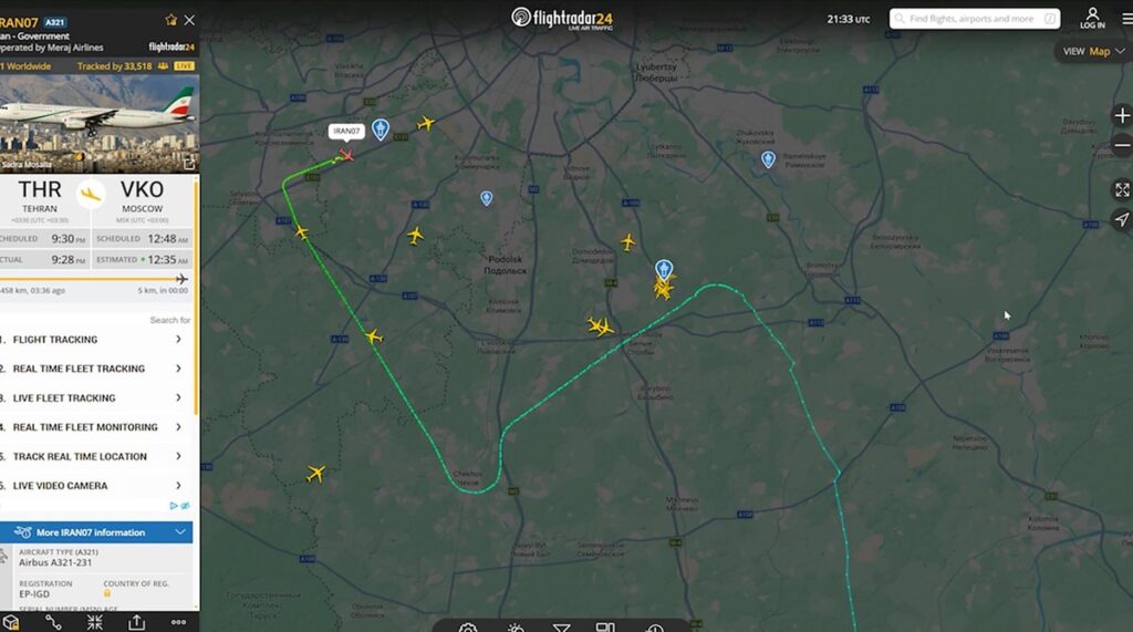 تصاویر راداری پرواز شبانه هواپیمای ریاست جمهوری از تهران به مسکو – تابناک